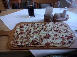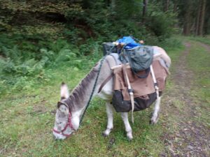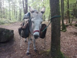 Heute Morgen ging es früh los. Frisch machen, Zelt abbauen und dann 25 Minuten nach Fischbach rein, erstmal an der Pferdepension vorbei. Da es auf dem Campingplatz nichts zu kaufen gab, habe ich beim Bäcker im Dorf gefrühstückt. Dann wieder zurück zur Eselpension. Heute kein Begrüßungsschrei…aber Gavroche kam dann schon von alleine in den Stall, wo ich das Gepäck vorbereitete.